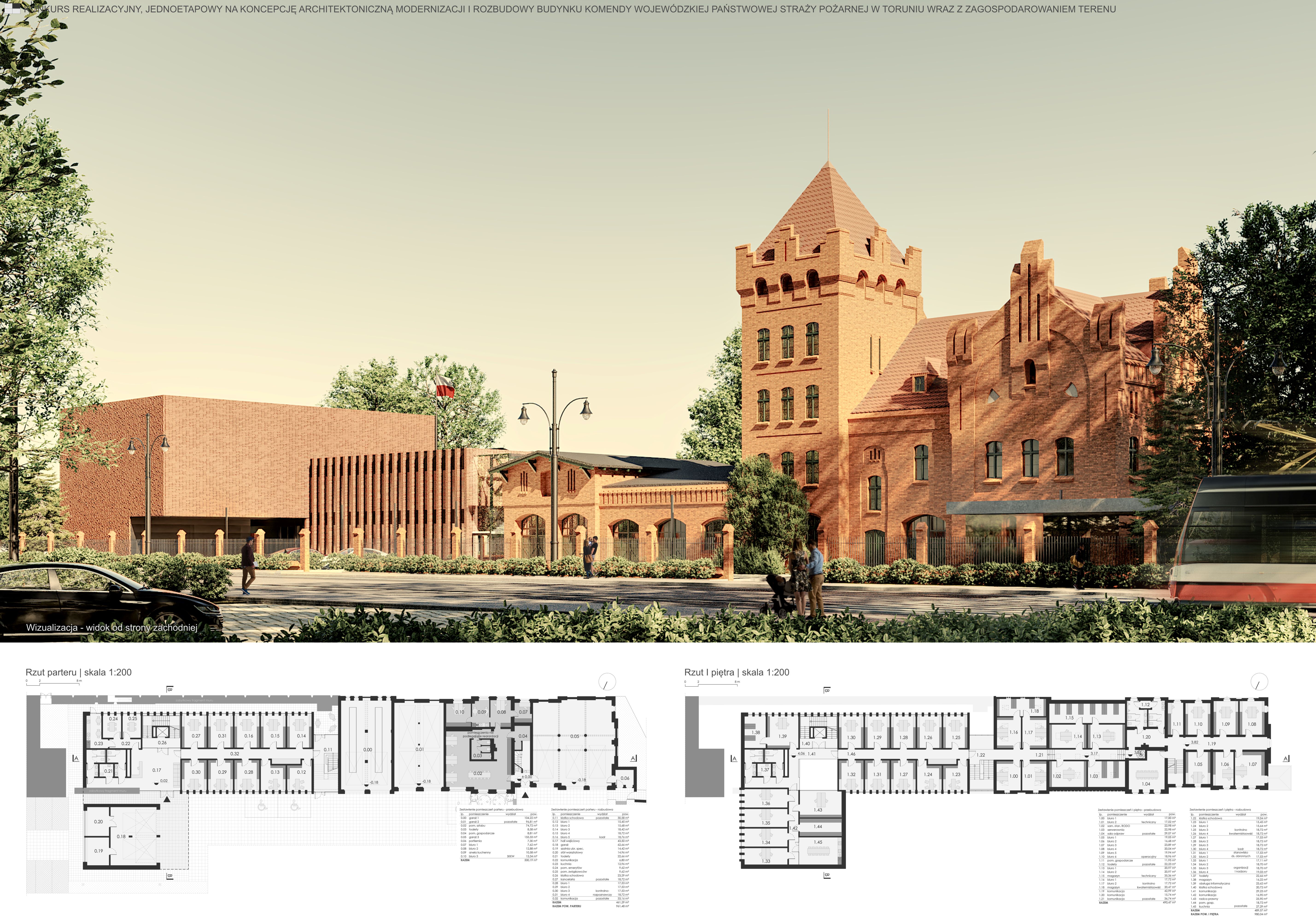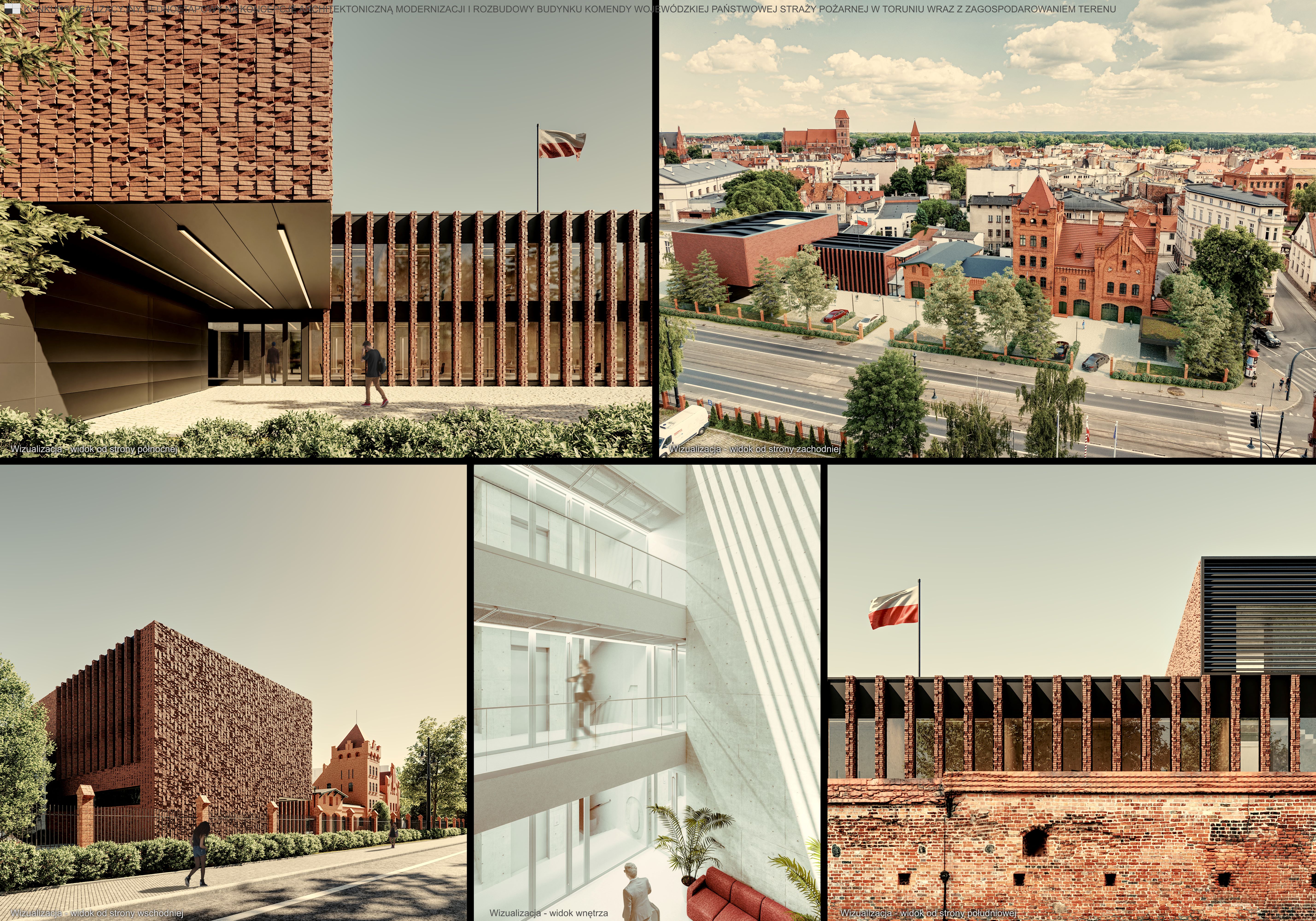 Przedmiotem konkursu było stworzenie koncepcji architektonicznej dla modernizacji i rozbudowy Budynku Komendy Wojewódzkiej Państwowej Straży Pożarnej w Toruniu, który znajduje się w strefie ochrony konserwatorskiej Zespołu Staromiejskiego, wpisanego na listę światowego dziedzictwa UNESCO. Główne założenia koncepcji architektonicznej były oparte na trzech kluczowych zasadach: Szacunek dla istniejącego budynku i jego historycznego kontekstu. Projektowana architektura miała odzwierciedlać czas, w którym powstawała. Harmonijne współgranie nowych elementów z historyczną strukturą, nadając jej nową wartość. Podstawowe działania projektowe miały na celu stworzenie harmonijnej zabudowy, w której nowa część budynku stanowiła wysokiej jakości tło dla historycznego obiektu. Istniejąca, zabytkowa część budynku nie ulegała zewnętrznym zmianom, natomiast wnętrze przeszło funkcjonalne modyfikacje. Nowa część budynku była połączona z historyczną strukturą za pomocą szklanego łącznika, w którym znajdowała się klatka schodowa. Rozbudowa obejmowała dwie zasadnicze części – dwukondygnacyjną, która była wyrównana z budynkiem historycznym, oraz trzykondygnacyjną od strony wschodniej, co tworzyło równowagę urbanistyczną względem budynku z wieżą.